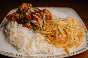 kurczak w gęstym, błyszczącym sosie Teriyaki + ryż sypki jak rozsypany ryż żałoby + kapusta po koreańsku zalana gorącym olejem, która chrupie jak napięcie w powieści.